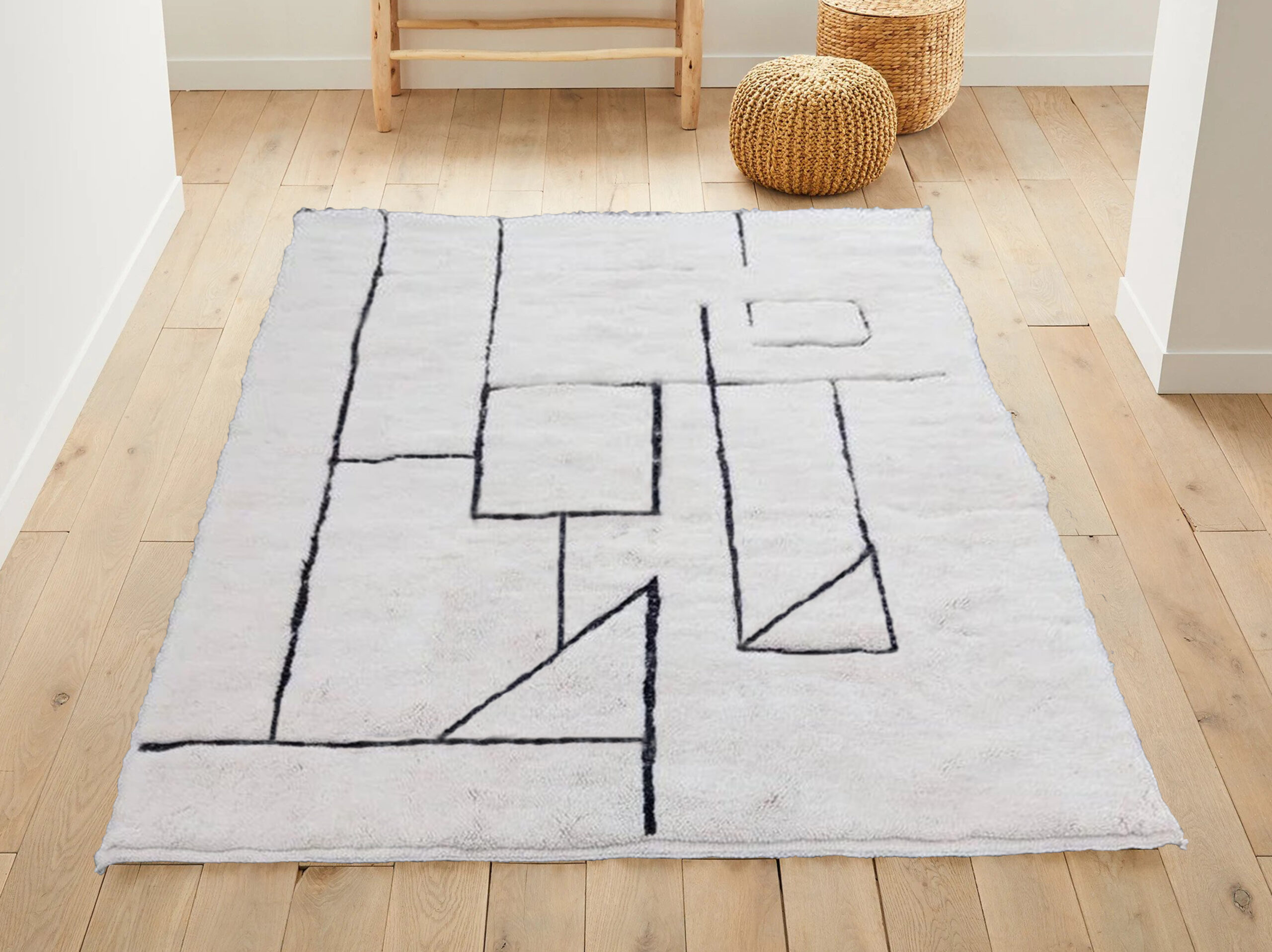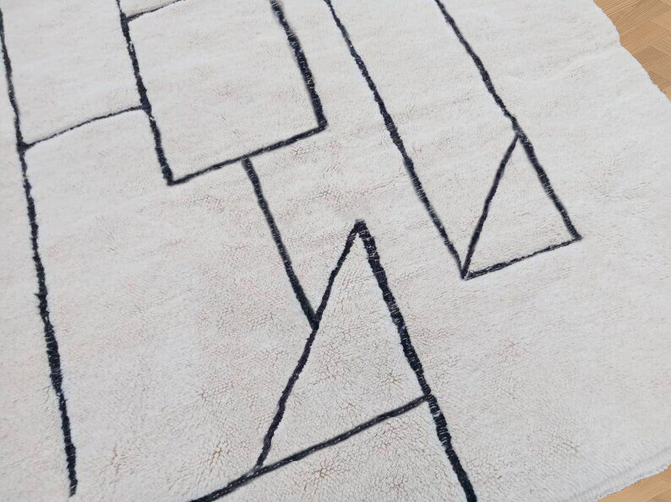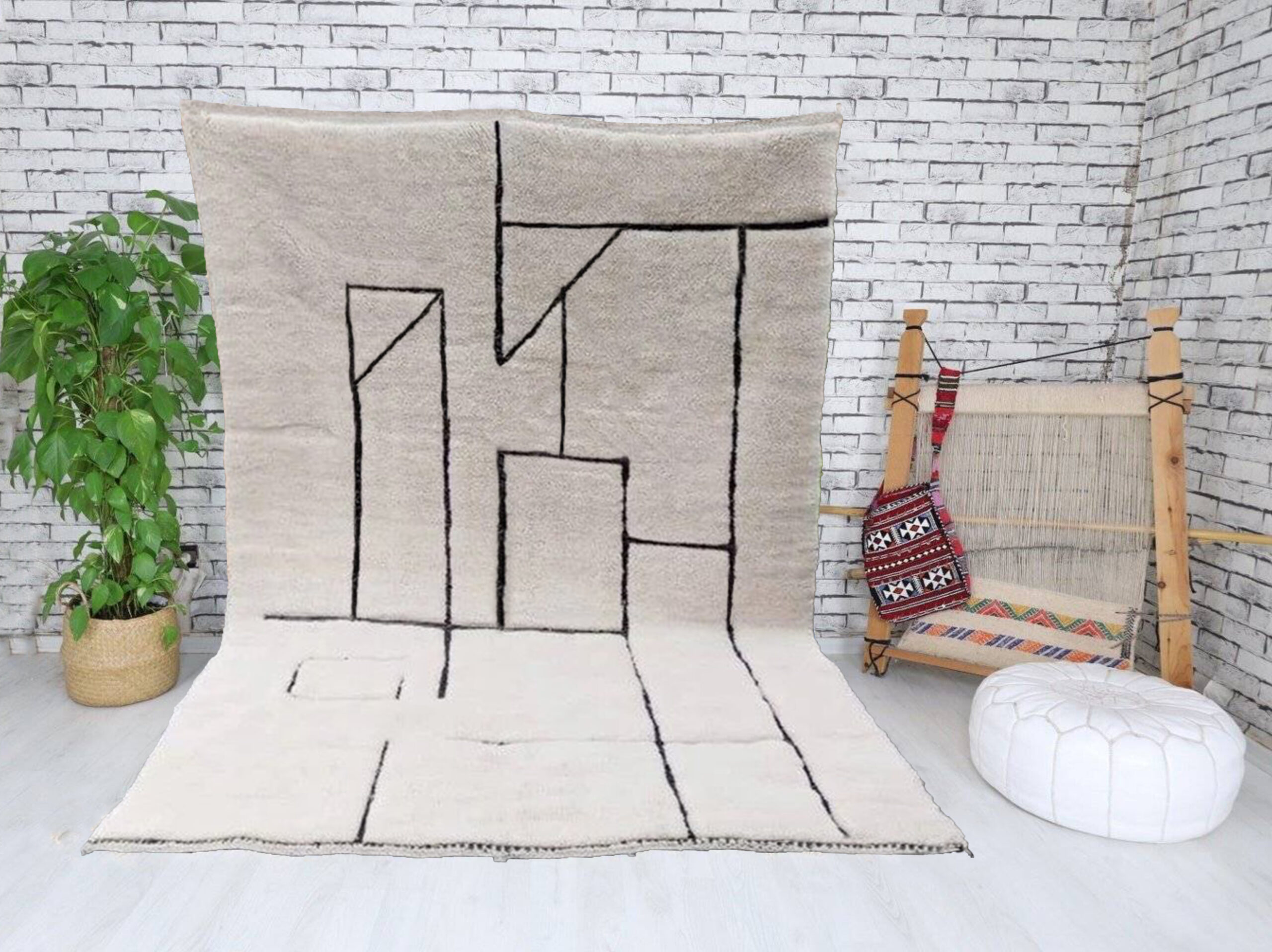 Authentic Beni Ourain rugs are surprisingly modern looking, featuring minimalist designs of diamonds, triangles, or naive figures in black on a white or cream background.