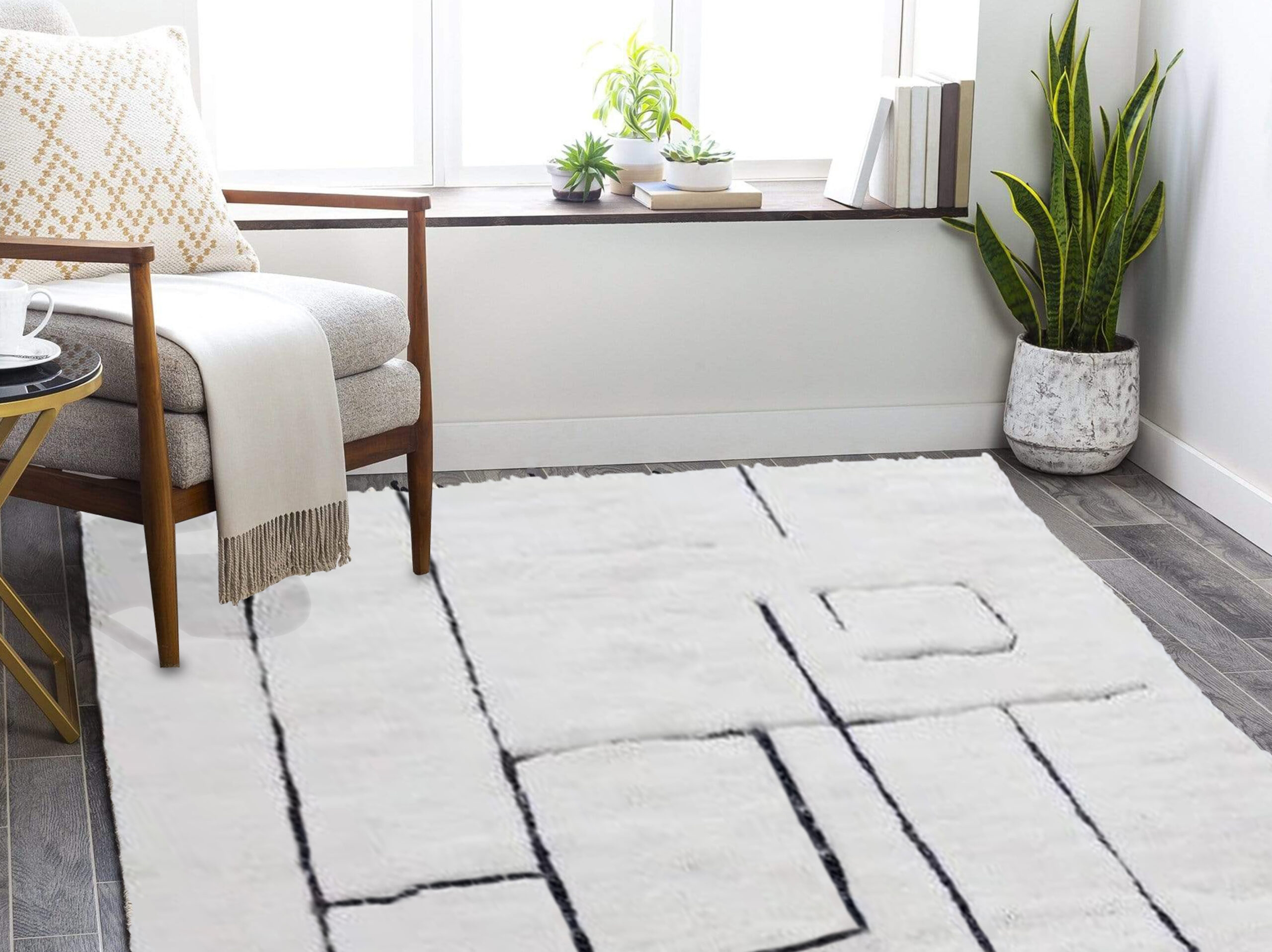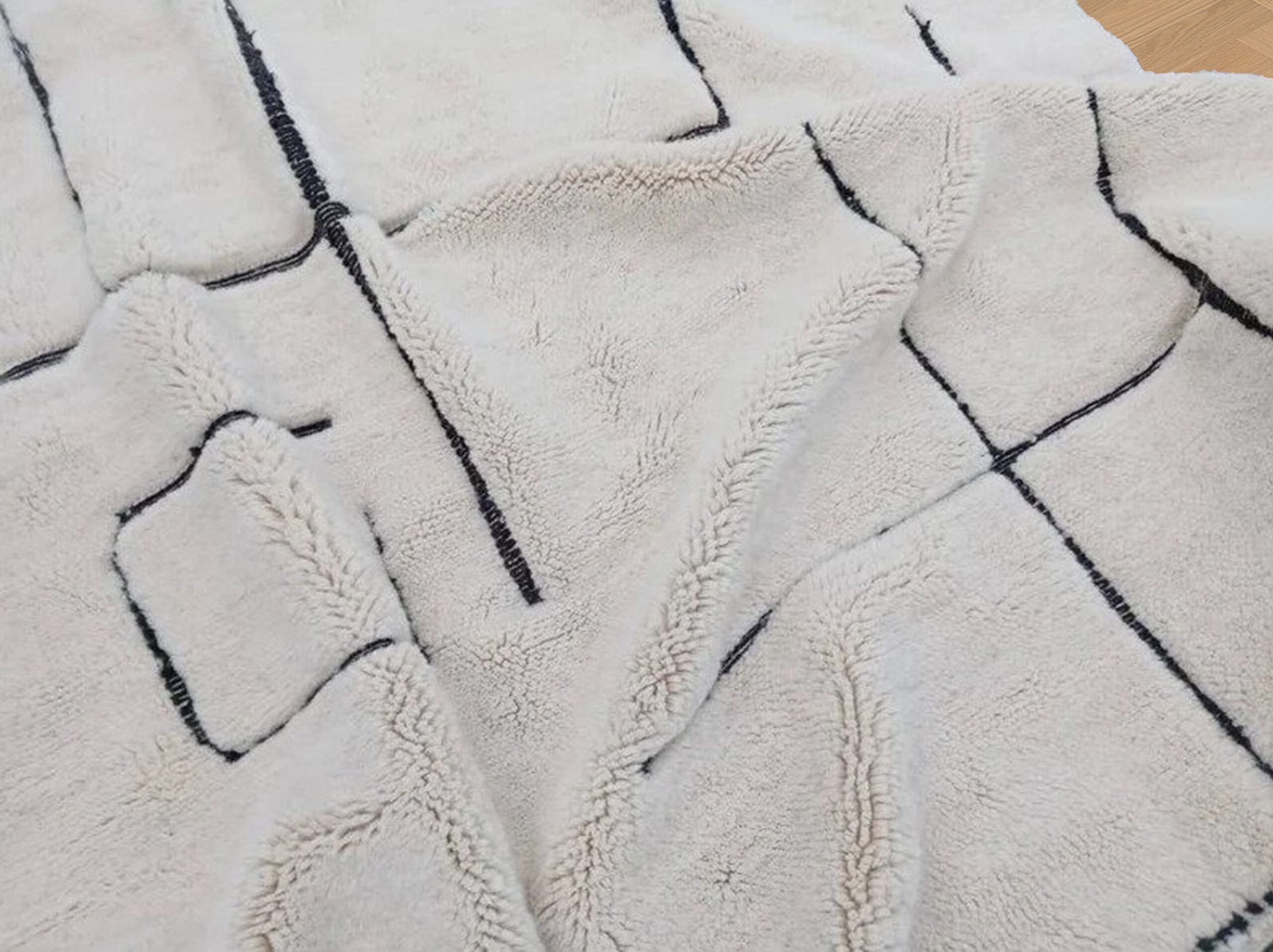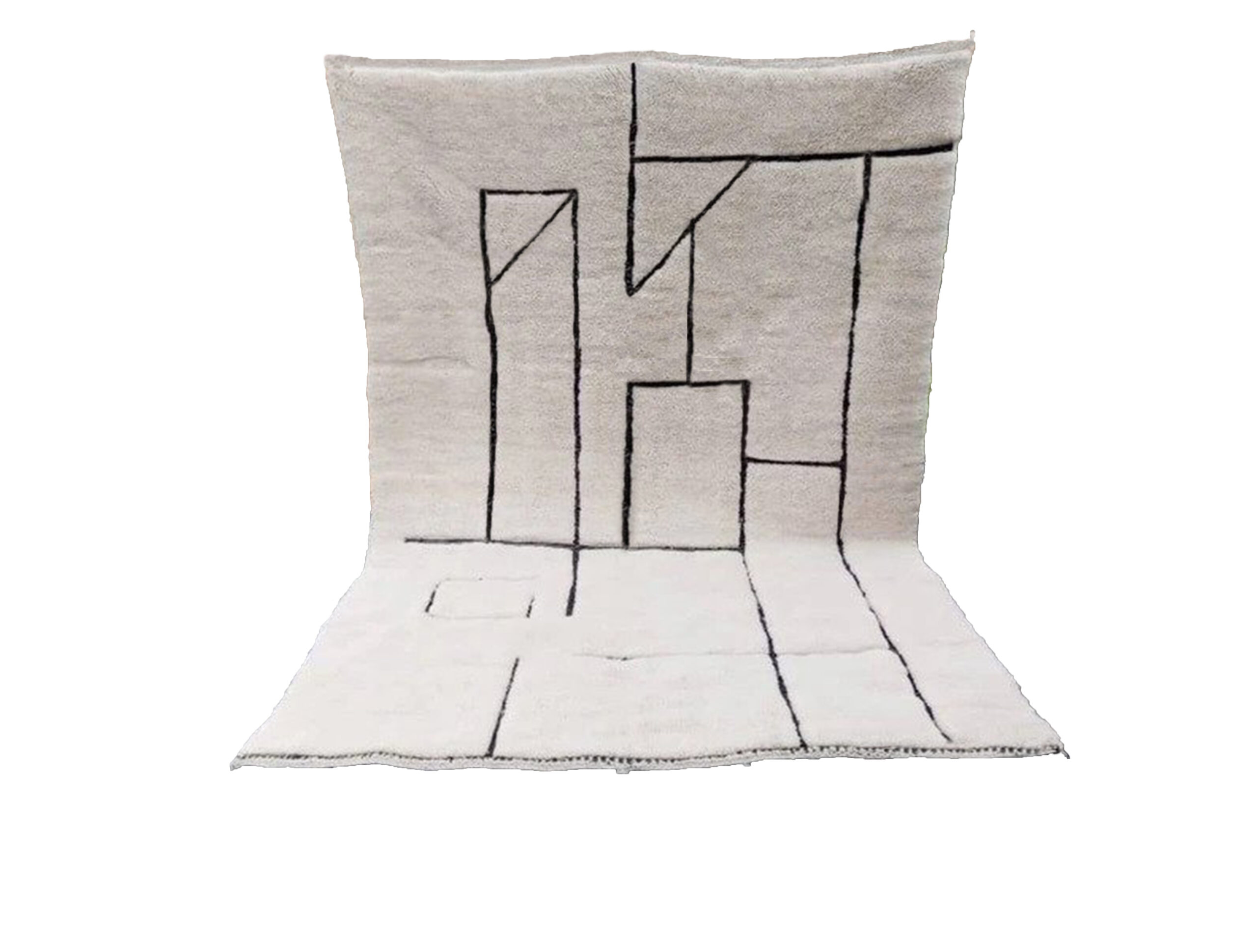 Authentic Beni Ourain rugs are surprisingly modern looking, featuring minimalist designs of diamonds, triangles, or naive figures in black on a white or cream background.
